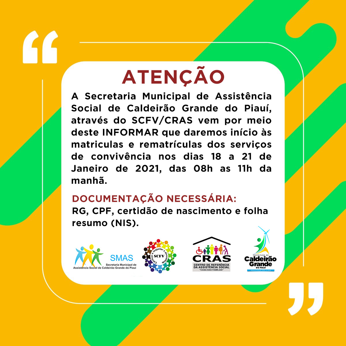 A Secretaria de Assistência Social de Caldeirão Grande do Piauí, através do Centro de Referência à Assistência Social (CRAS), abre na próxima segunda-feira, 18 de janeiro, as matrículas e rematrículas para os grupos do Serviço de Convivência e Fortalecimento de Vínculos (SCFV).